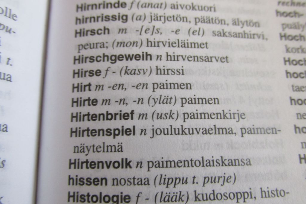 Laitan otteen sanakirjasta suomi-saksa-suomi, jossa on hir-alkuisia sanoja: