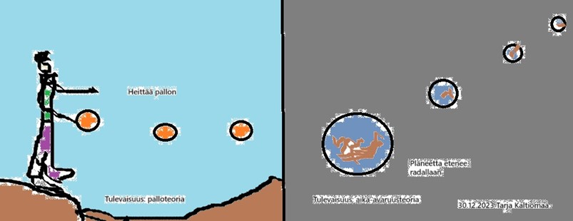 Kuva 2: Planeetta liikkuu avaruudessa. Voimme havaita ja myös uskoa planeetan tulevaisuuteen aika-avaruudessa (uutta ajallista ajattelua ja teoriaa).