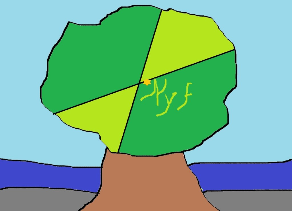 Kuva: Puumainen aikagraafi, jossa on tiimalasi-tyyppinen aikakuvaus. Piirros: Tarja Kaltiomaa (MS Paint -tekniikka)