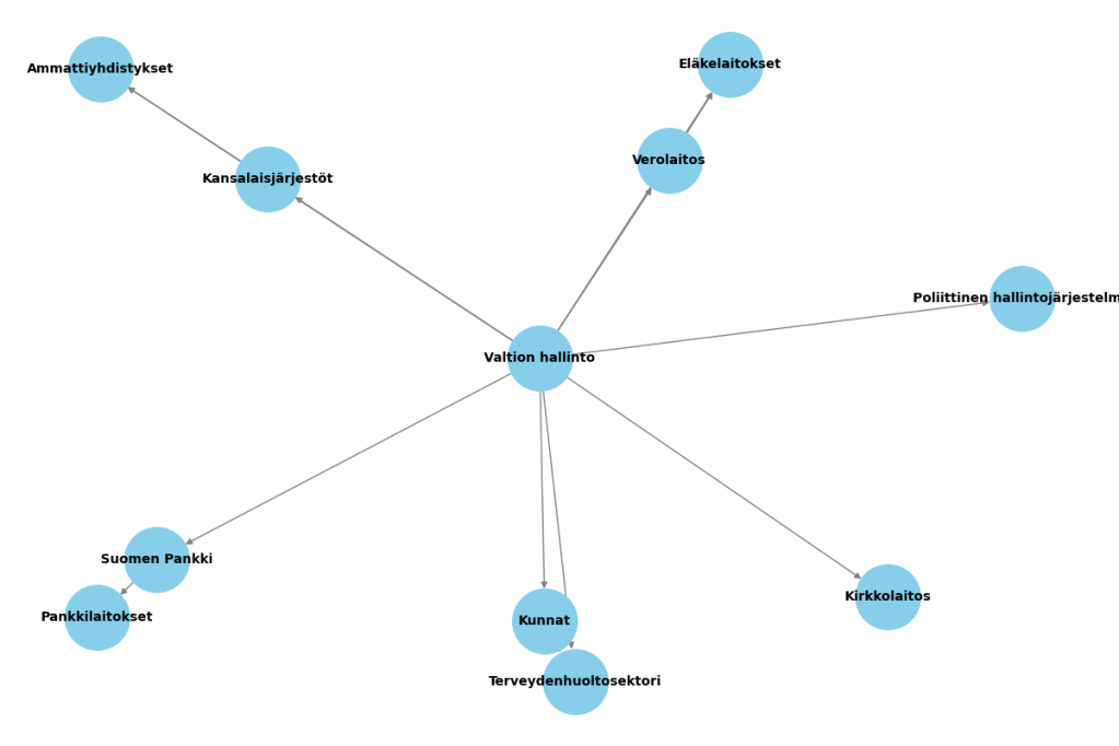 Sain alla olevan graafisen esityksen teknoäly Copilotilta ja siten säästin merkittävästi omaa aikaani tämän blogikirjoituksen laatimisessa. Rajattu tehtävänanto on tässä: Voisitko piirtää graafisen esityksen näistä elementeistä: Näitä organisaatioita ovat valtion hallinto, poliittinen hallintojärjestelmä, pankkilaitokset Suomen pankin johdolla, eläkelaitokset, ammattiyhdistykset, kansalaisjärjestöt vapaaehtoistyön avulla, verolaitos, kunnat, terveydenhuoltosektori, kirkkolaitos?
