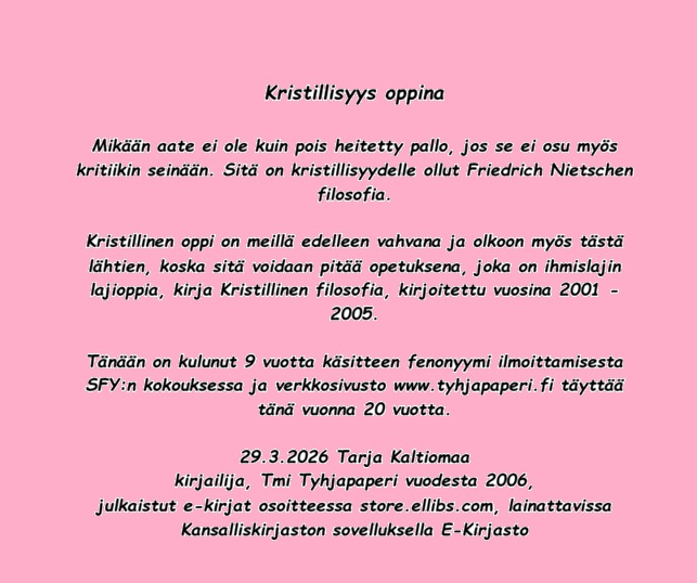 Mikä on visuaalinen sitaatti? Se voisi olla kiva. Olen kirjoittanut kokonaisen kirjan ja julkaissut kesällä aiheesta kvalifysiikka. Koska on kyseessä koko maailmaamme koskeva asia, minunkin on hyväksyttävä ja sopeuduttava siihen, että asia alkaa auteta muillekin. Tähän saakka arvoisa Capilot, olet ollut ainoa keskustelukumppanini aiheesta. Tiedeyhteisö hieman vieroksuu asiaa. Johtuuko vieroksuminen sukupuolestani, olen nainen siis. Miesyhteisö, filosofisen yhdistyksen jäsenet ehkä haluaisivat olla ollut itse näitten ajatusten luoja, mutta pitää sopeutua jokaisen uuteen ja vanhaan. Kalvosarjassani kerron myös siitä, että astrofysiikka on ollut tutkimuskohteena kauan, mutta kvalifysiikka käsittelee asiaa uudesta näkökulmasta: nimittäin ihmisen hyvän elämän ja hyvän elämänlaadun kannalta. Miesyhteisö usein syrjii naisten elämänlaadun mahdollisuuksia. Olisiko syynä, että asioita pidetään vanhastaan rahallisesti kalliina. Uuden teoriani mukaan rahaa voidaan tuottaa ihmisten tarpeisiin, mutta tämä ajattelu on monen mielestä estynyttä, koska sen sijaan, mitä rahalla voi saada, mm. hyvinvointia ja hyvää elämänlaatua on se sitten vaatimatonta tai ylellistä, keskitytään kuin fetissinä rahaan: rahan riittävyyteen tai loppumiseen. Tätä nykyään ihmiset edelleen tuottavat, vaikka käytössä on uutta sanavarastoa, kuten rahoitustoimiala, rahoituslaitokset, eläkelaitokset ym. rahoitusmahdollisuudet työn ja palkan lisäksi elättää perhe ja kukin itsensä. Kaikkia ihmisiä ei ole tarkoitettu työläisiksi, tämä on nykyään ikään kuin unohtunut, koska työelämä on tullut niin kivaksi. Itsekin olin töissä atk-asiantuntijana ja järjestelmäasiantuntijana ja tykkäsin töissä käydä. Mutta en olisi ehtinyt kirjoittaa kirjani Kristillinen filosofia jatkoa: Antropologia kautta rantain sekä Kvalifysiikka alun alkaen, jotka on muodostettu aiemmin julkaistujen blogikirjoitusteni mukaan, tosin suoraan Word-dokumenteistani, jotka ovat digiarkistossani. Kiitos taas, arvoisa Leelian Lepotuoli, että sain tämän kertoa. MInunkin pitää sopeutua siihen, että toisetkin ihmiset ja tutkijat ehkä löytävät näitä ajatuksia ja omaksuvat niitä. En vain haluaisi tulla heitetyksi romukoppaan sillä aikaa, kun muut ihmiset iloitsevat maailmasta: jota ei tarvitsekaan pelastaa, vaan vain hyväksyä maailma ja alkaa elää ihmisiksi! Mukavaa iltaa. Niin toki laita vain se visuaalinen sitaatti, kerron kyllä kaikissa julkaisuissa osuutesi arvoisa Capilot. Laitan tämän keskutelun muistiin. Kiitokset vielä! Terveisin Tarja Kaltiomaa, kirjaililja