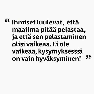 ”Maailman pelastaminen ei ole vaikeaa — se on hyväksymistä. Kun ihminen hyväksyy maailman ja sopeutuu siihen, hän löytää rauhan. Ja silloin avautuu myös tulevaisuus.”